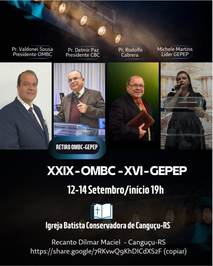 Começa na próxima sexta-feira, 12 de setembro, na cidade de Canguçu, o 29º Retiro da Ordem de Ministros Batistas Conservadores (OMBC). O evento reunirá pastores, evangelistas e presbíteros de diversas regiões da Convenção Batista Conservadora, e acontecerá no Sítio Recanto Dilmar Maciel.